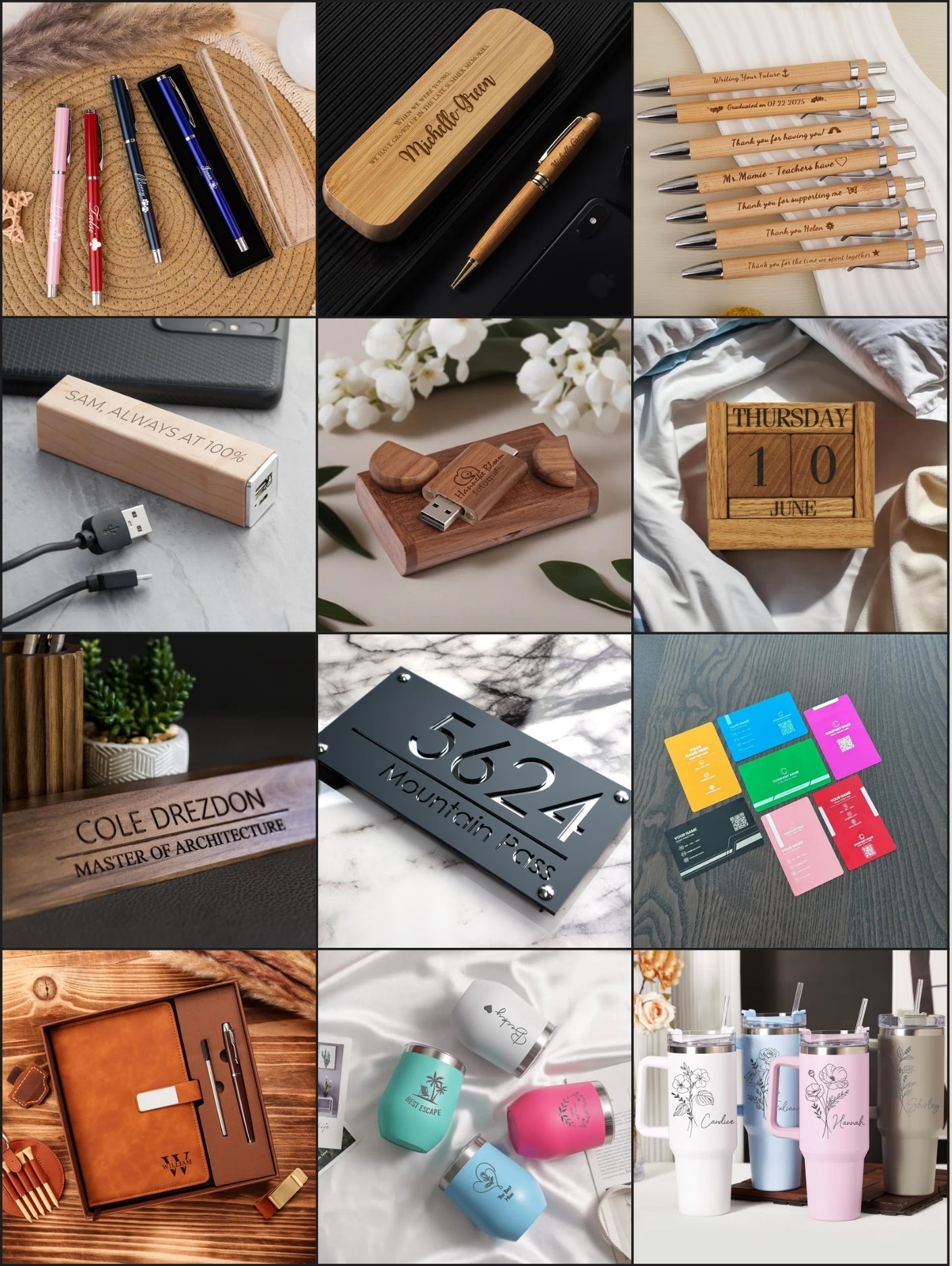 Our Office Essentials Collection brings organization and elegance together. From personalized desk accessories to engraved stationery and nameplates, each piece is designed to elevate your daily workflow while showcasing your brand’s attention to detail.