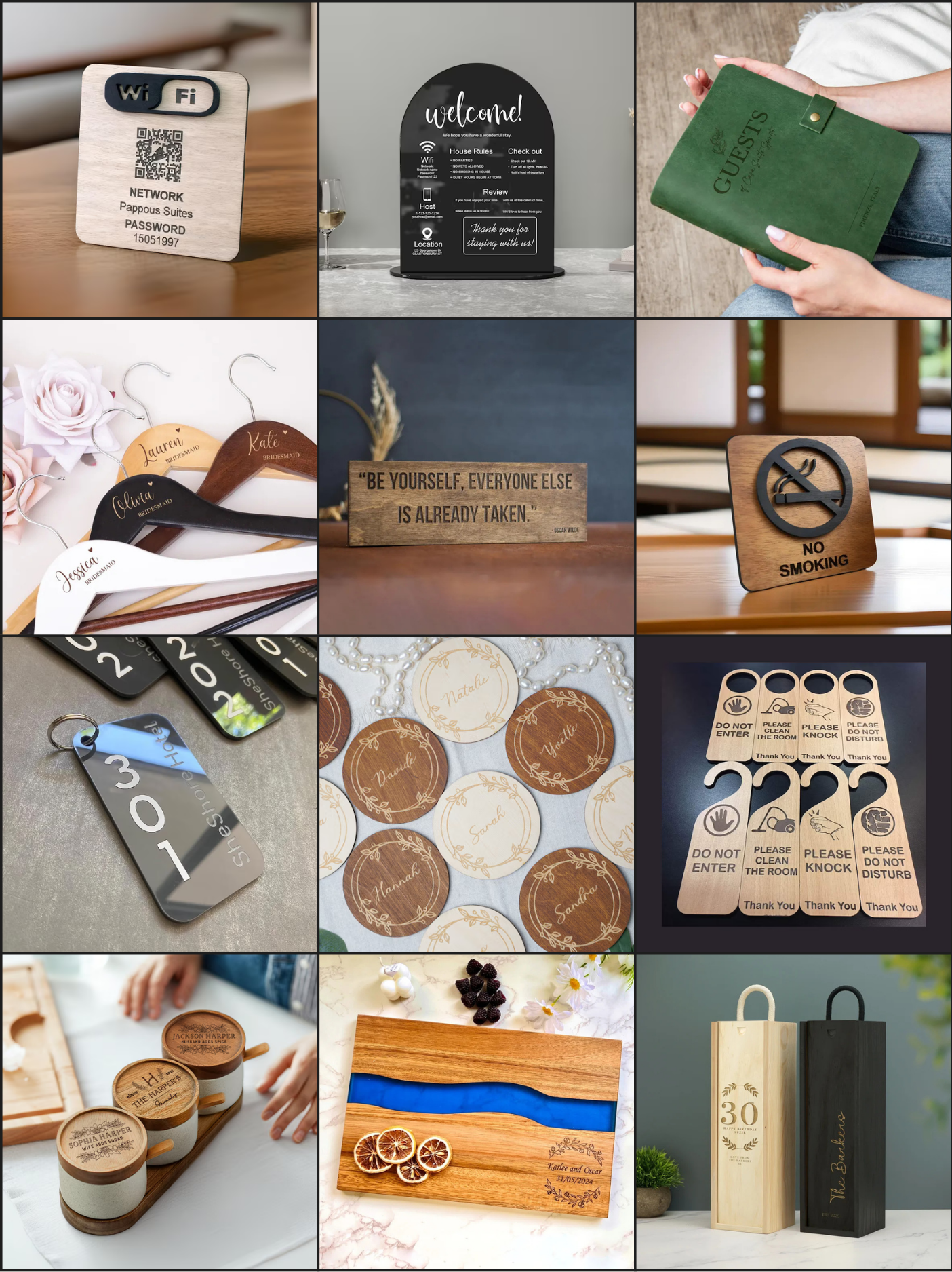 Our Hotel & Airbnb Collection adds a sense of care and sophistication to every stay. From custom keychains and signage to engraved welcome boards and room accessories, these pieces create a lasting impression and reflect your commitment to quality hospitality.
